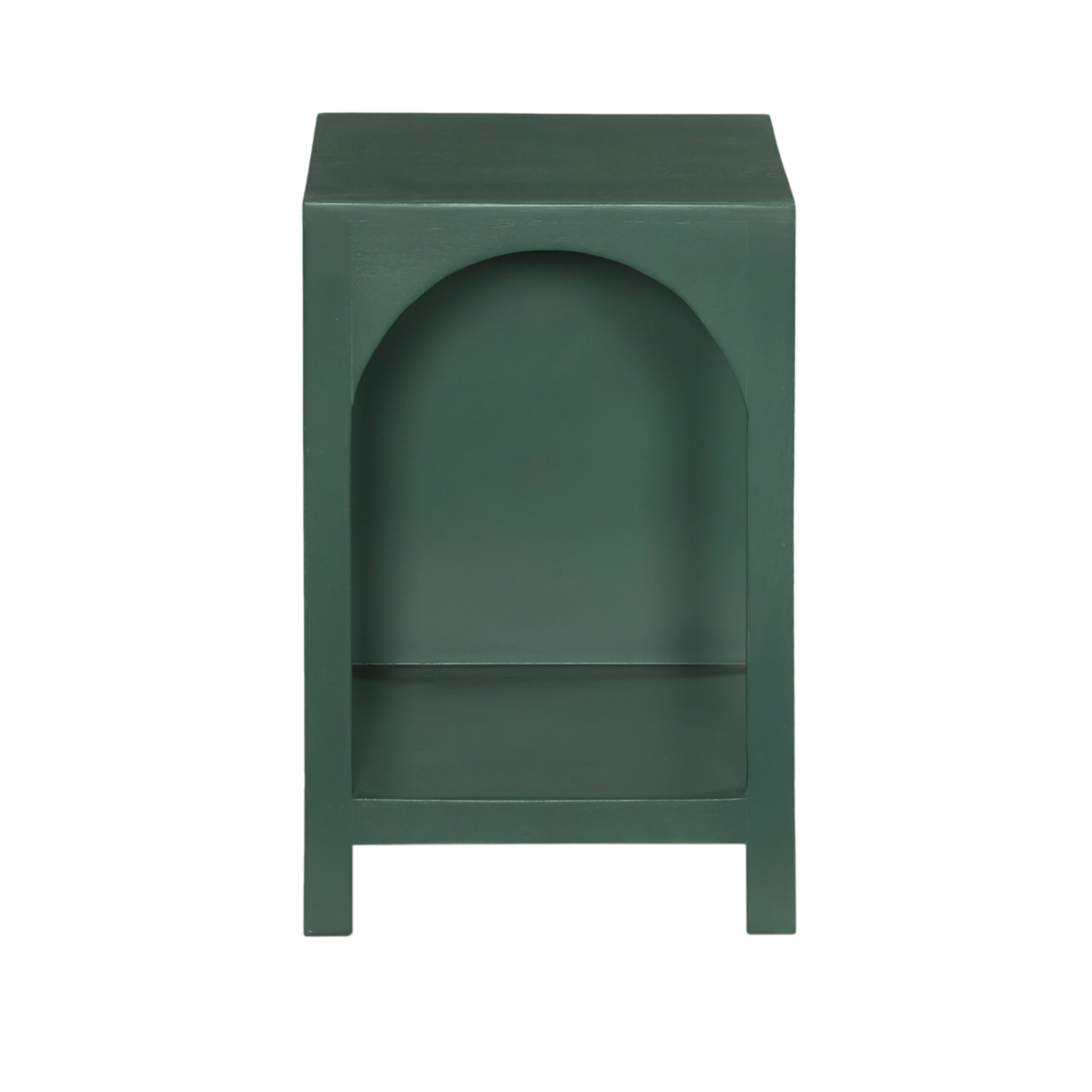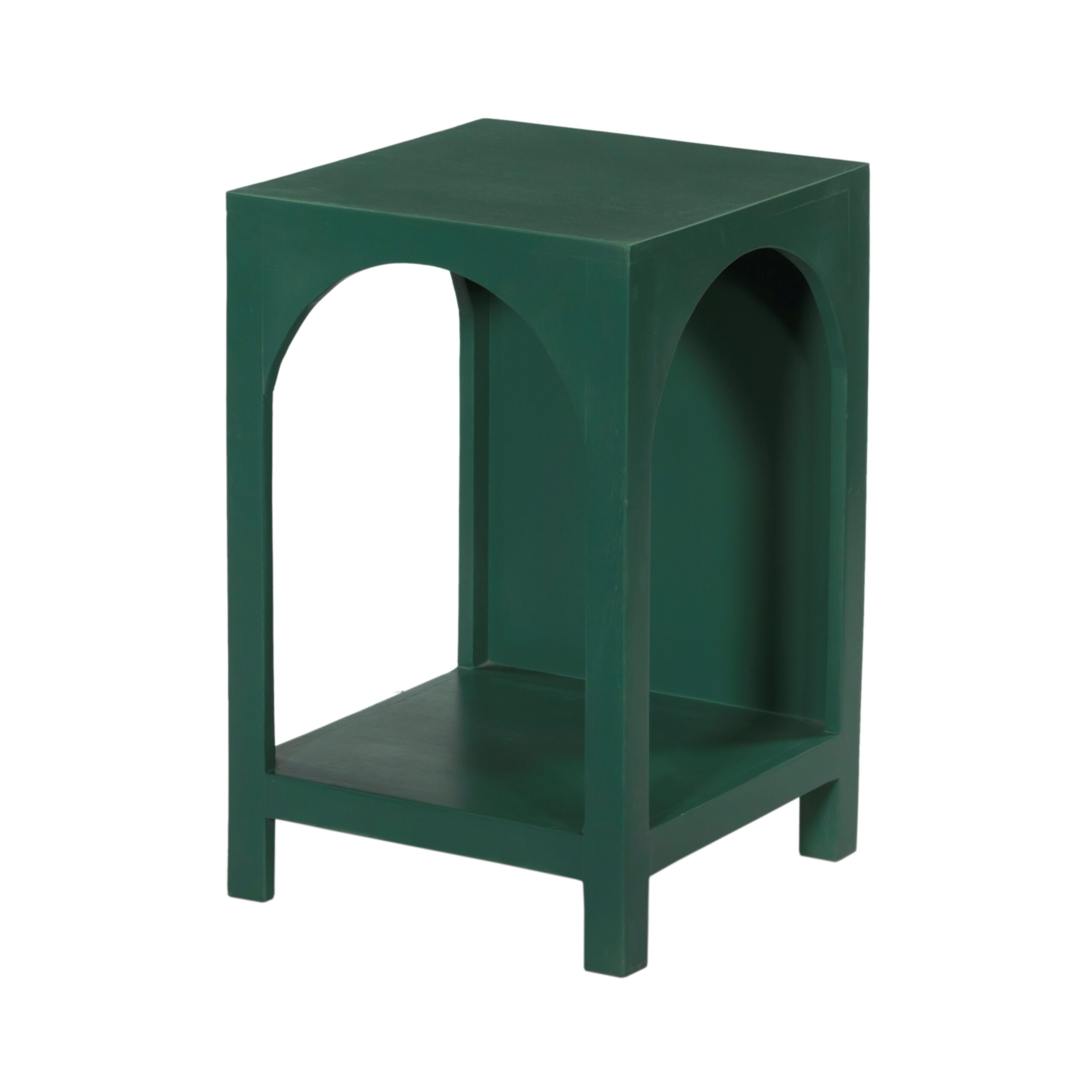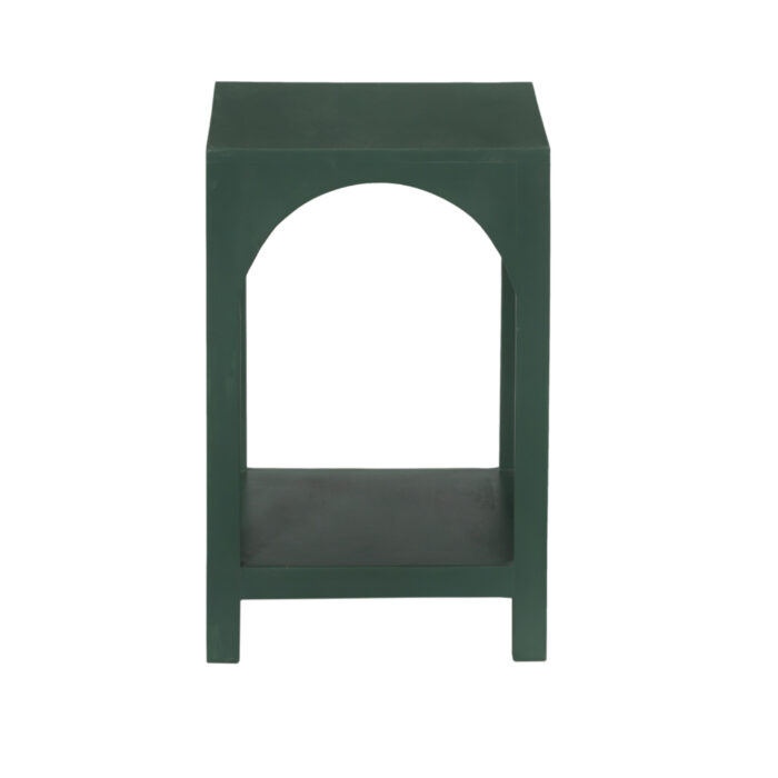 The Arch side table offers a blend of architectural inspiration and modern design. Crafted in a rich, deep green hue, the table features a square tabletop and a lower shelf, providing ample surface space for display and storage. The defining characteristic is the prominent arched cutouts on each side, creating a sense of openness and visual interest. These arches not only contribute to the table’s unique aesthetic but also allow light to pass through, preventing it from feeling bulky in a room. This versatile piece can serve as a stylish accent in a living room, bedroom, or hallway.