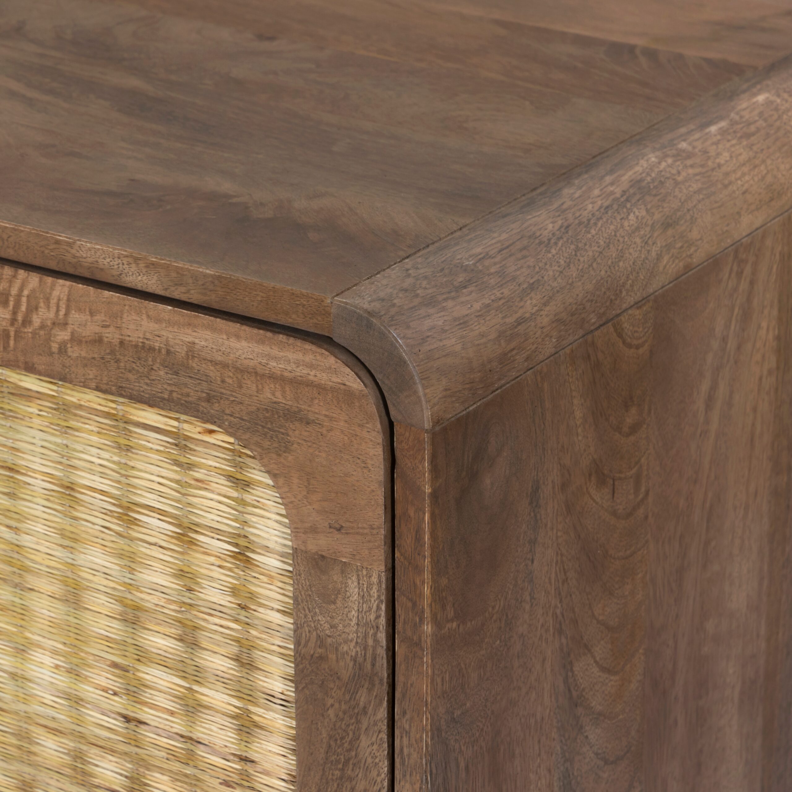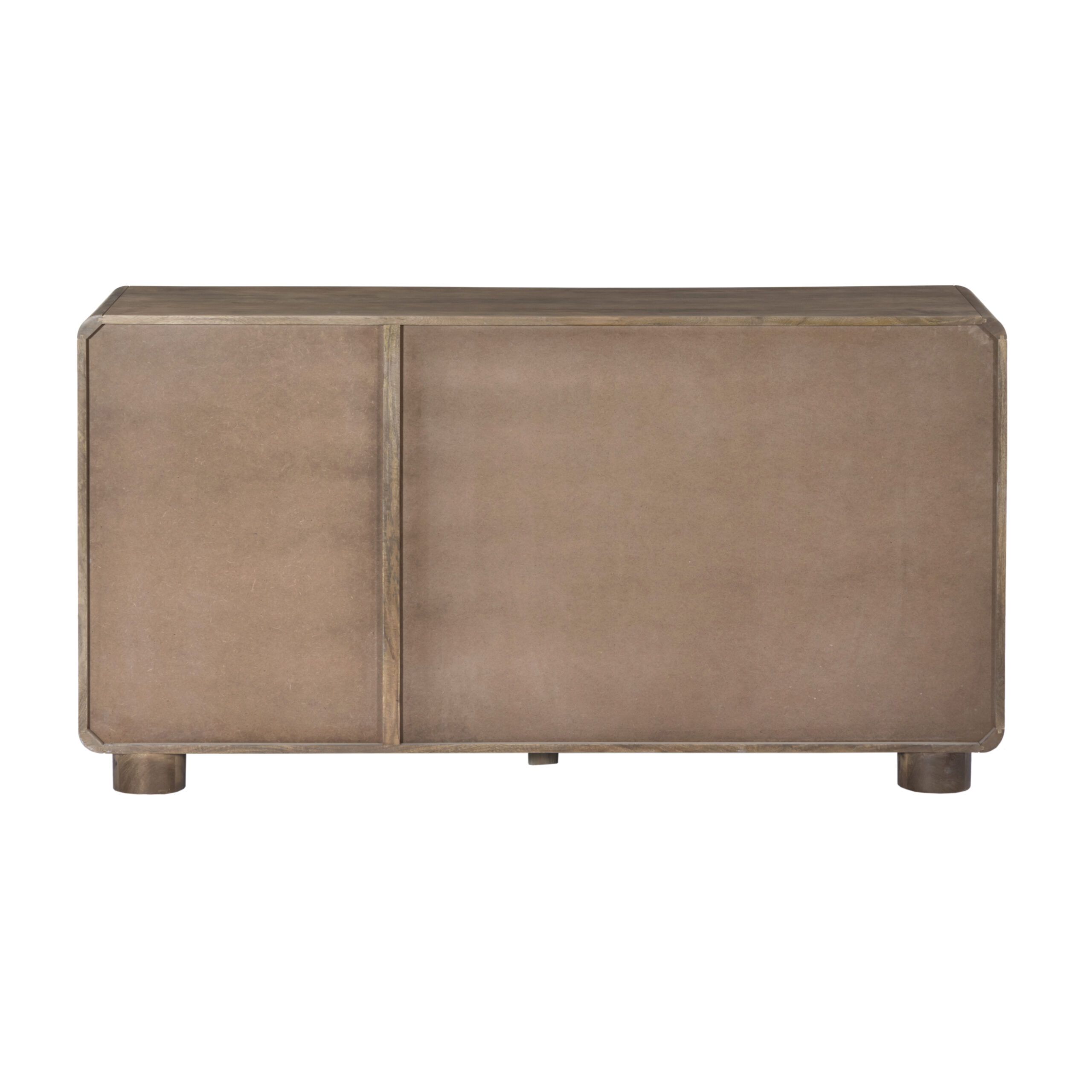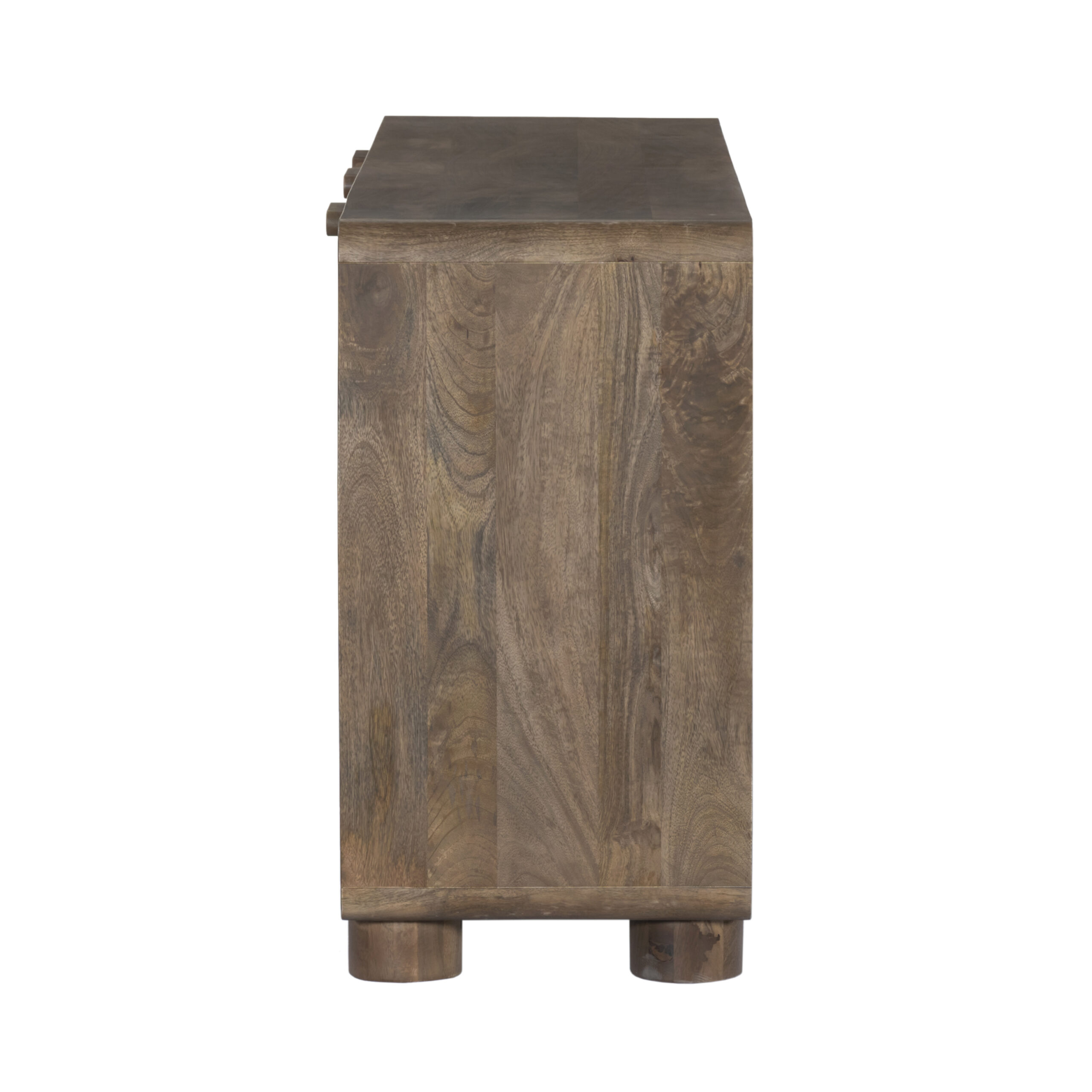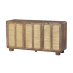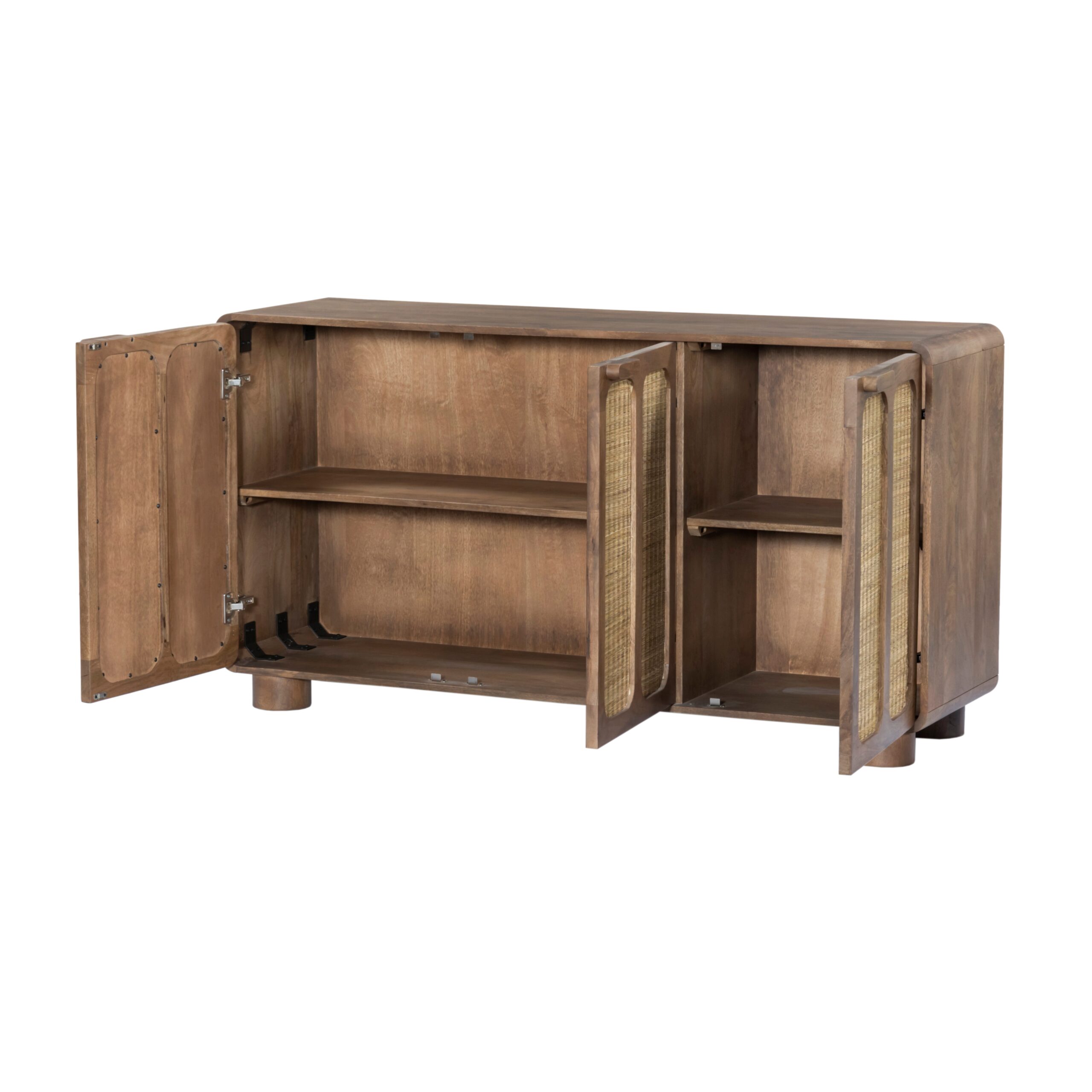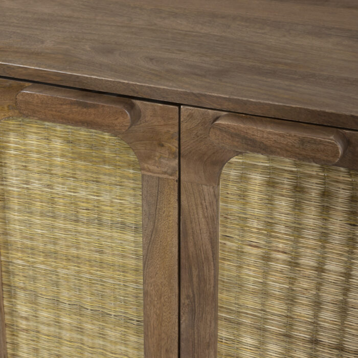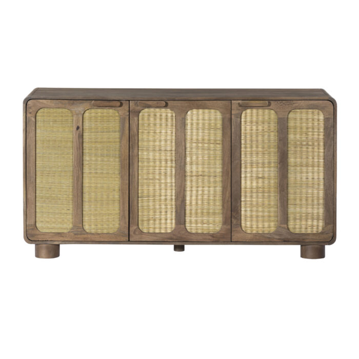 Grassland three-door sideboard offers a blend of natural textures and contemporary design. Crafted from durable acacia wood, the sideboard features a warm, inviting tone that complements a variety of décor styles. Each of the three doors is inlaid with two panels of woven sea grass matting, creating a striking contrast and adding a touch of natural, bohemian charm. The sideboard’s clean lines and gently rounded edges create a contemporary silhouette. It’s perfect for adding a touch of relaxed elegance to a living room, dining room, or hallway.