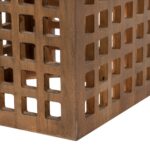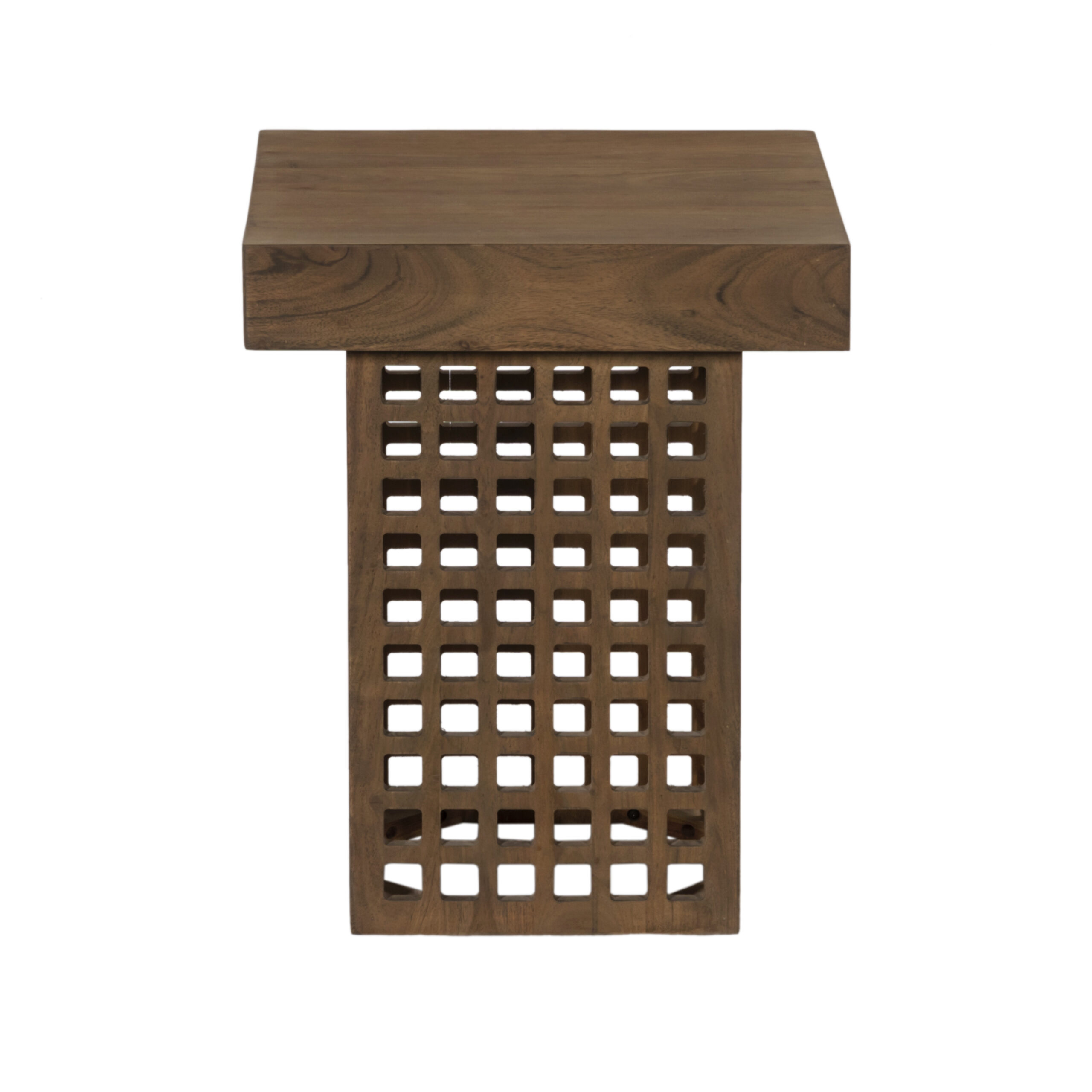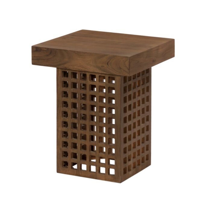 The Grid Side Table is a unique lattice-style base adds a bold geometric appeal, allowing light and shadows to interplay beautifully through the open grid structure. Topped with a thick, solid wood surface that is actually hollow from inside, this table offers a sturdy and functional space for décor, books, or essentials. The rich, natural grain of the acacia wood is enhanced by a warm finish, making it a timeless addition to both contemporary and rustic interiors. Compact yet eye-catching, this side table serves as a versatile accent piece, ideal for living rooms, bedrooms, or office spaces.