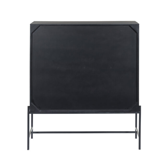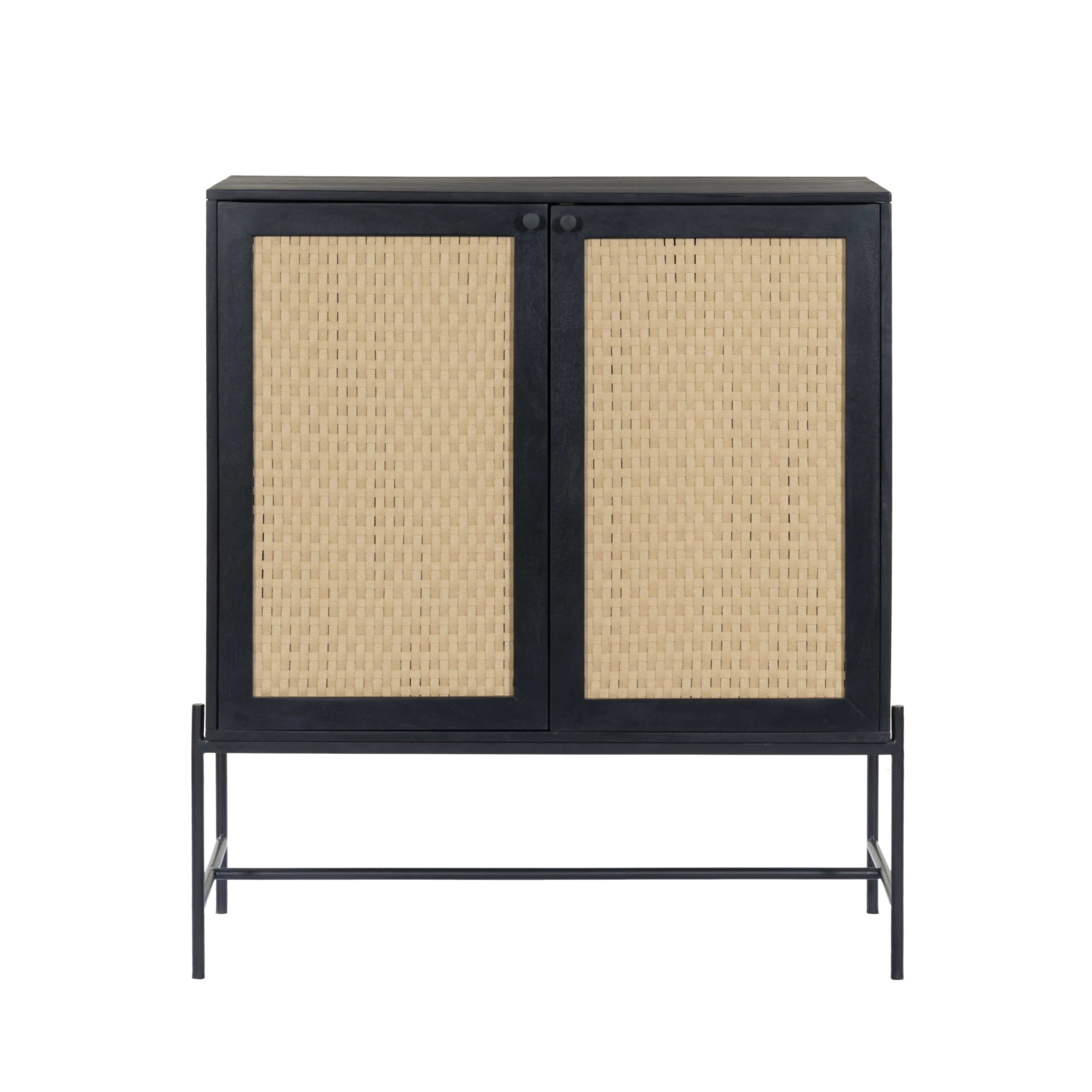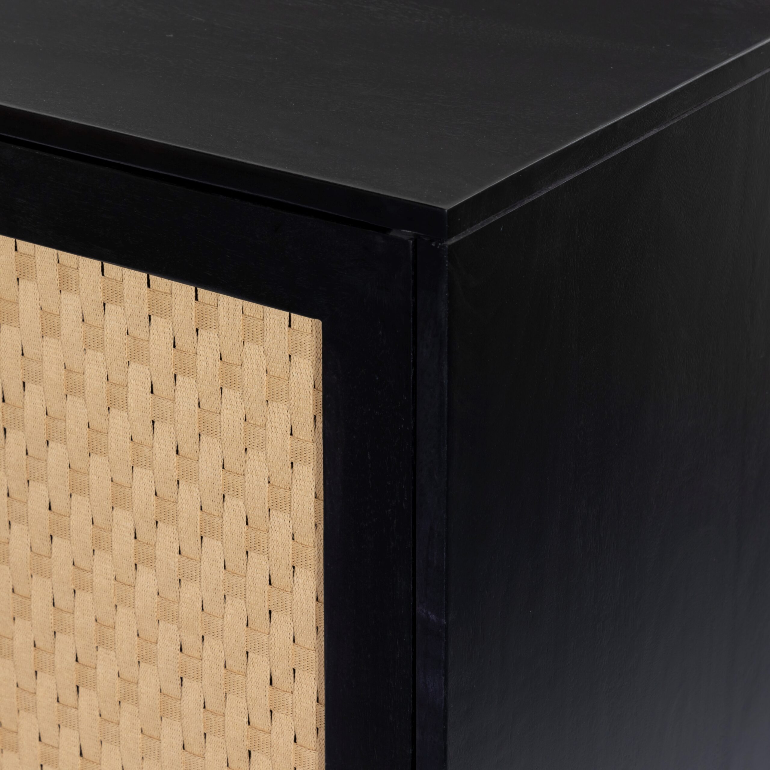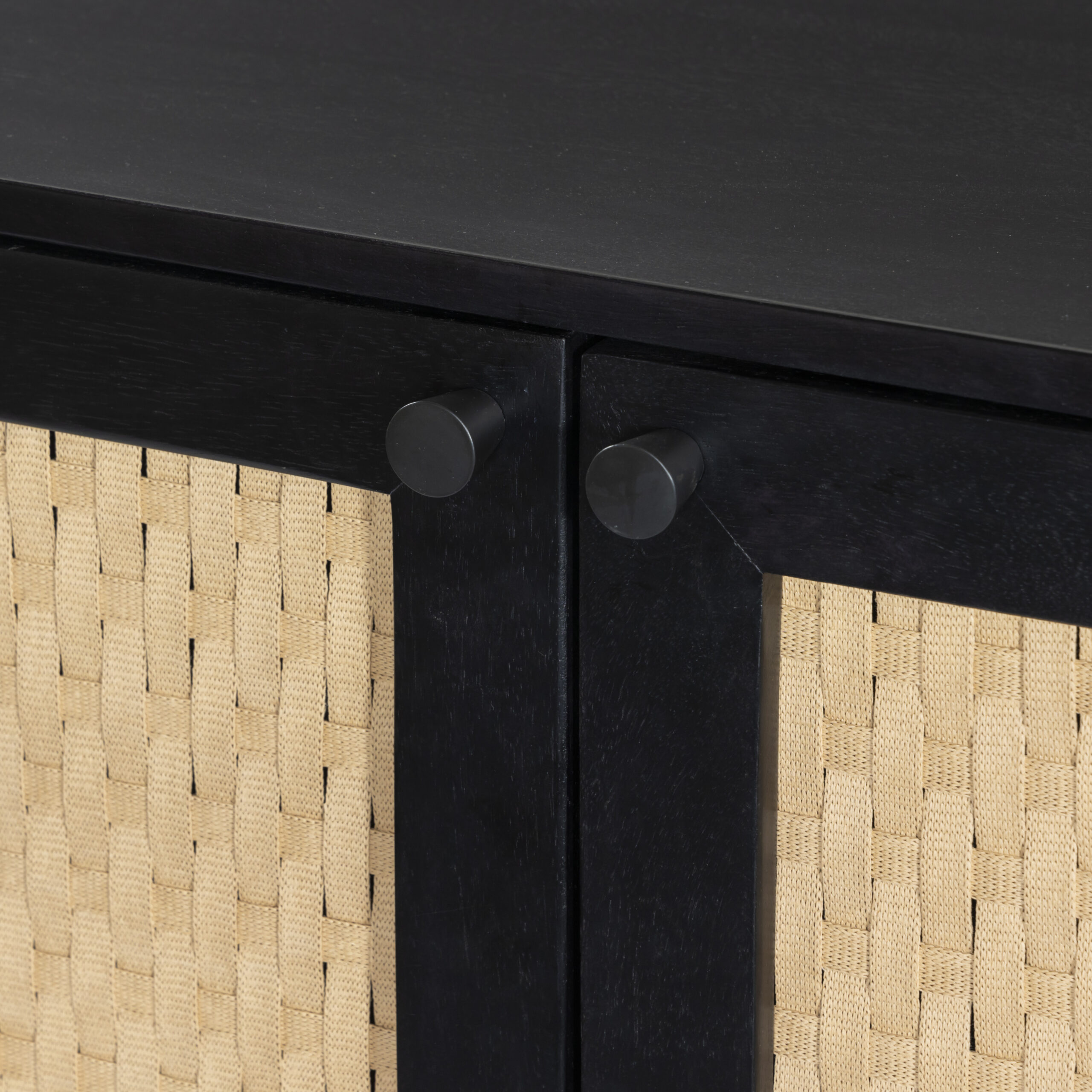 Stylish two-door sideboard offers a blend of modern design and sustainable materials of paper cord. The cabinet body is made with mango wood, known for its durability and beautiful grain patterns. The doors feature woven paper ribbon panels, a unique and eco-friendly alternative to traditional materials, adding a touch of natural texture and visual interest. The sideboard is elevated by sleek, metallic legs, giving it a light and airy feel while providing sturdy support. The contrast between the dark frame, natural woven doors, and metallic legs creates a striking visual appeal. Its sustainable construction makes it an environmentally conscious choice for your home.