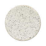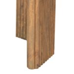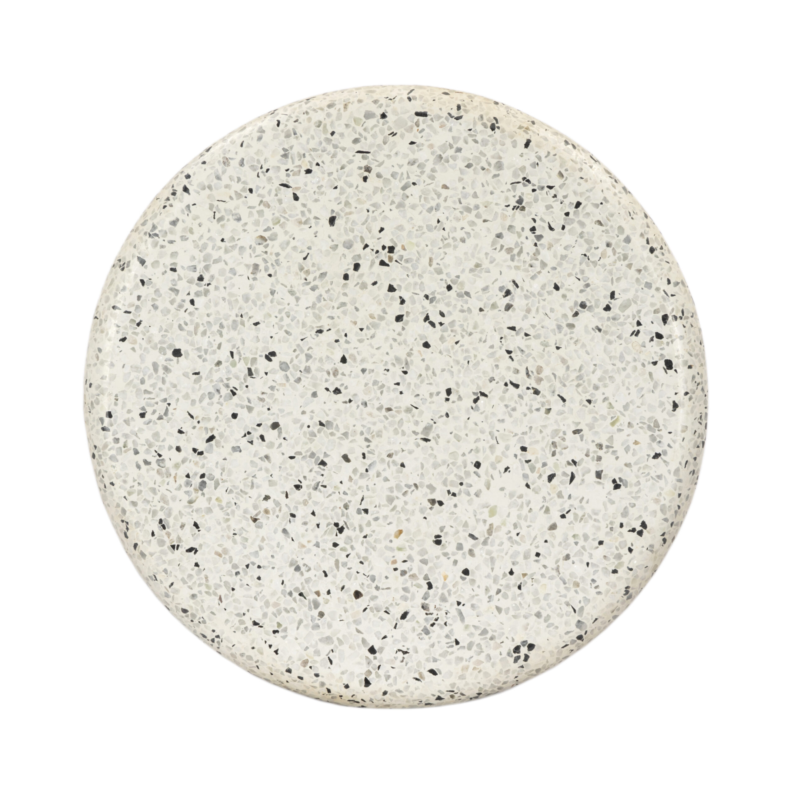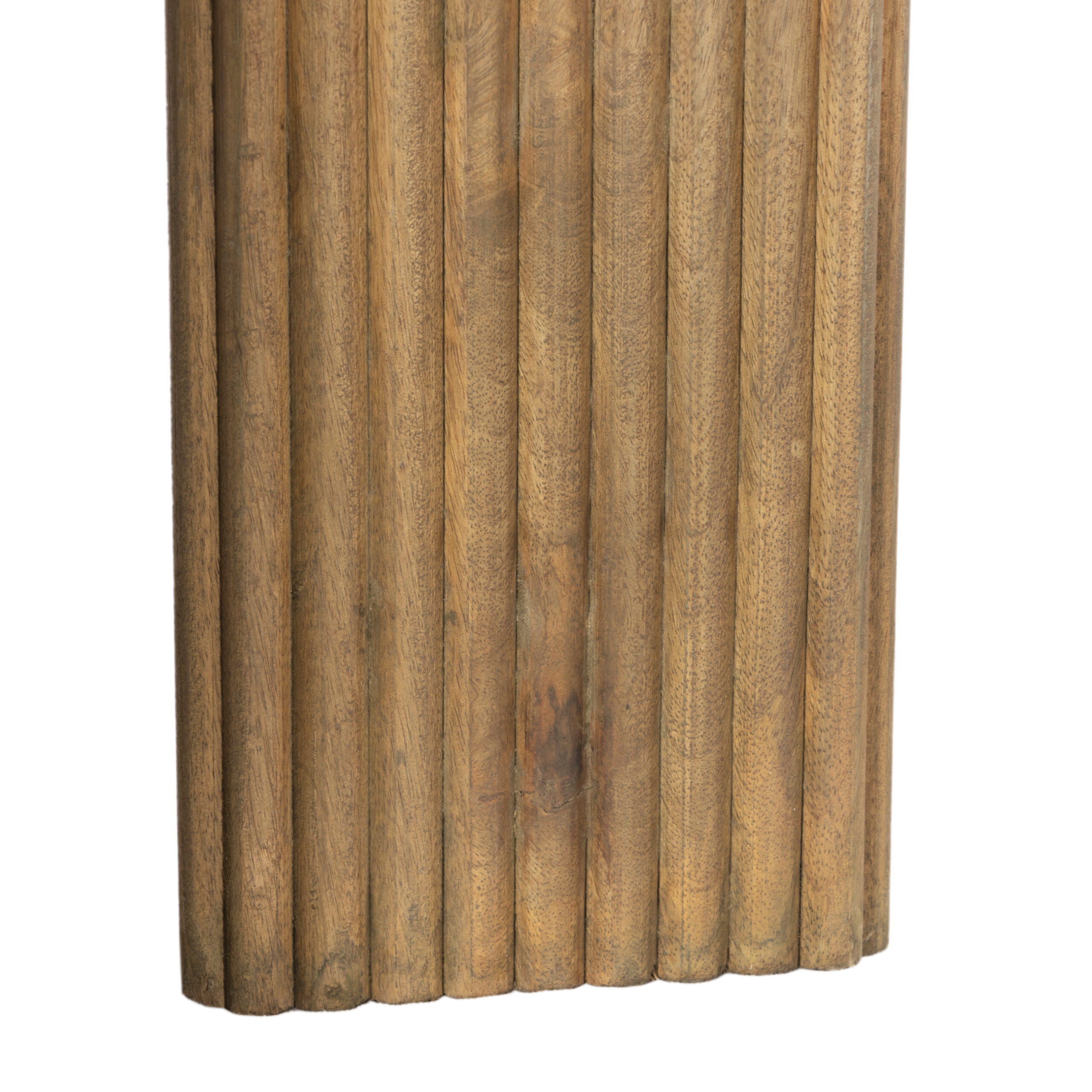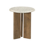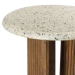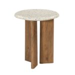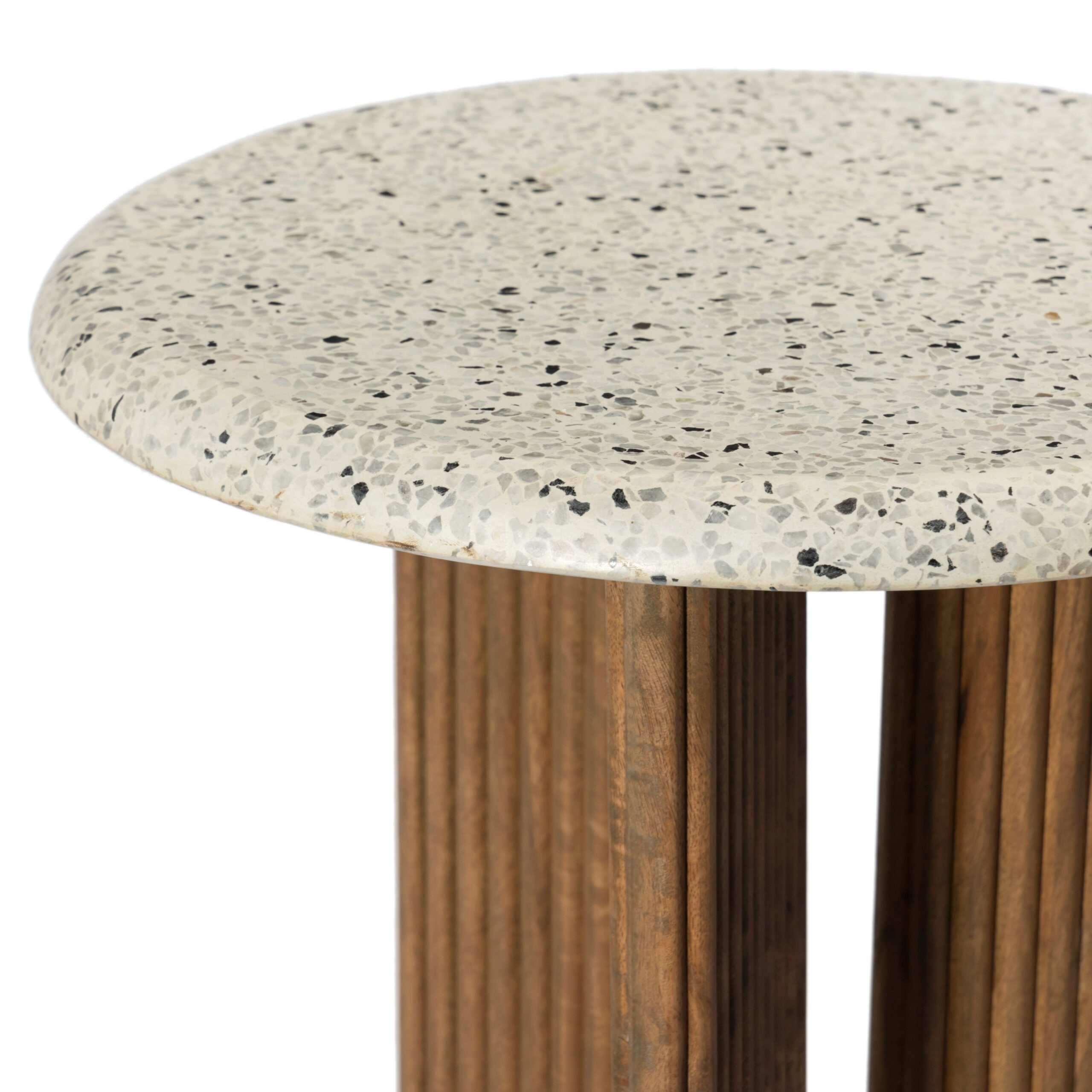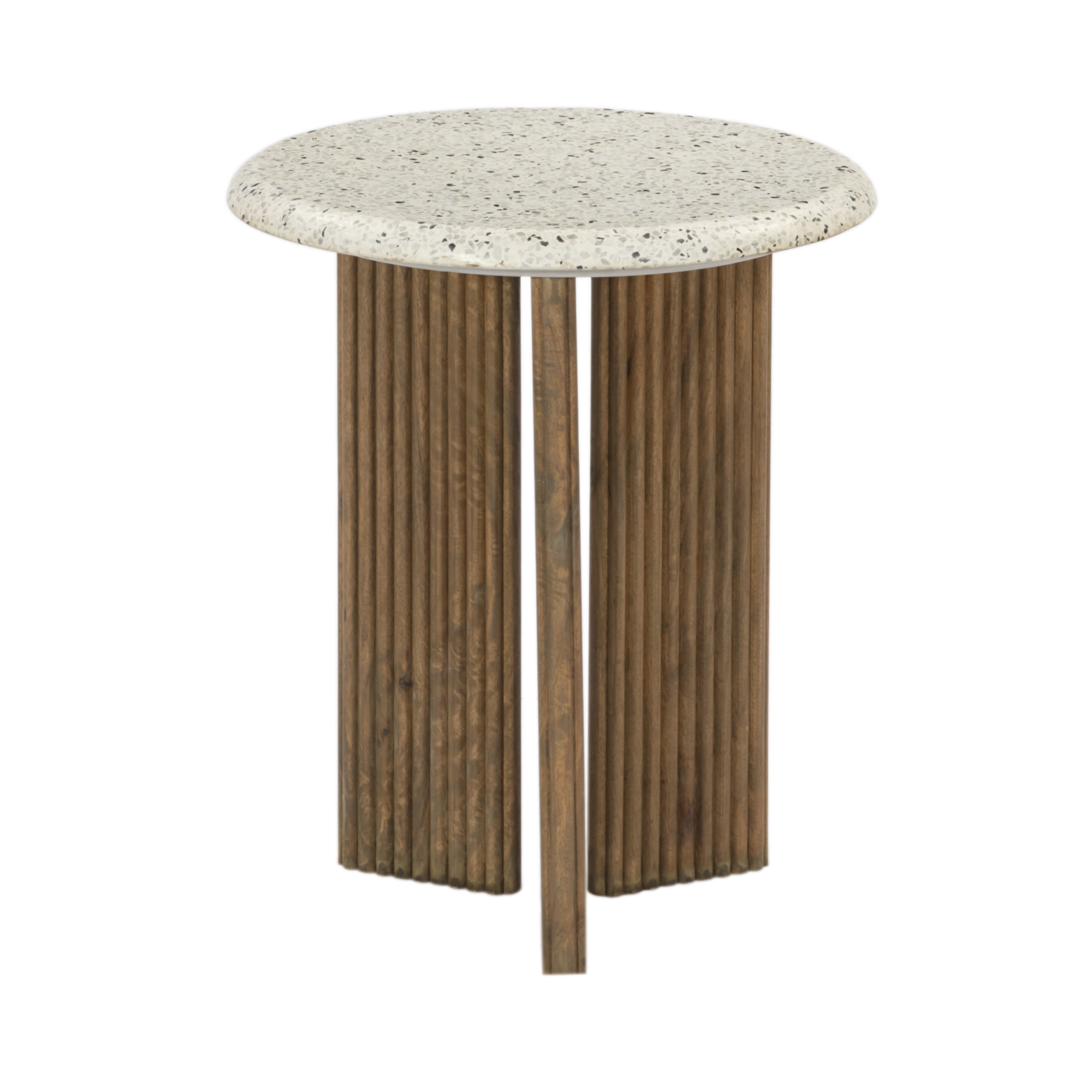 The side table combines the cool, speckled texture of terrazzo with the warm, natural look of mango wood. The circular tabletop features a classic terrazzo pattern, adding a touch of modern sophistication. Supporting this top are three fluted mango wood legs, each with vertical grooves that create a visually appealing ribbed effect. This fluting adds both texture and a subtle sense of refinement. The contrast between the smooth terrazzo and the textured wood creates a striking visual balance, making this side table a versatile and eye-catching addition to any contemporary living space. Perfect for displaying a lamp, plant, or other decorative items.
