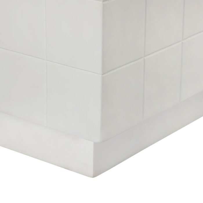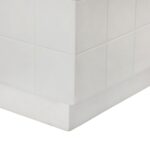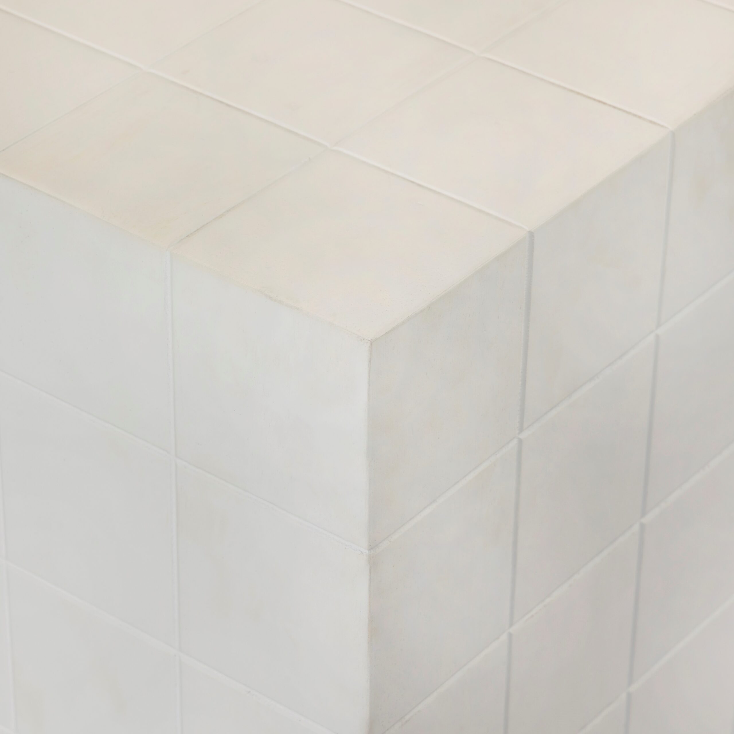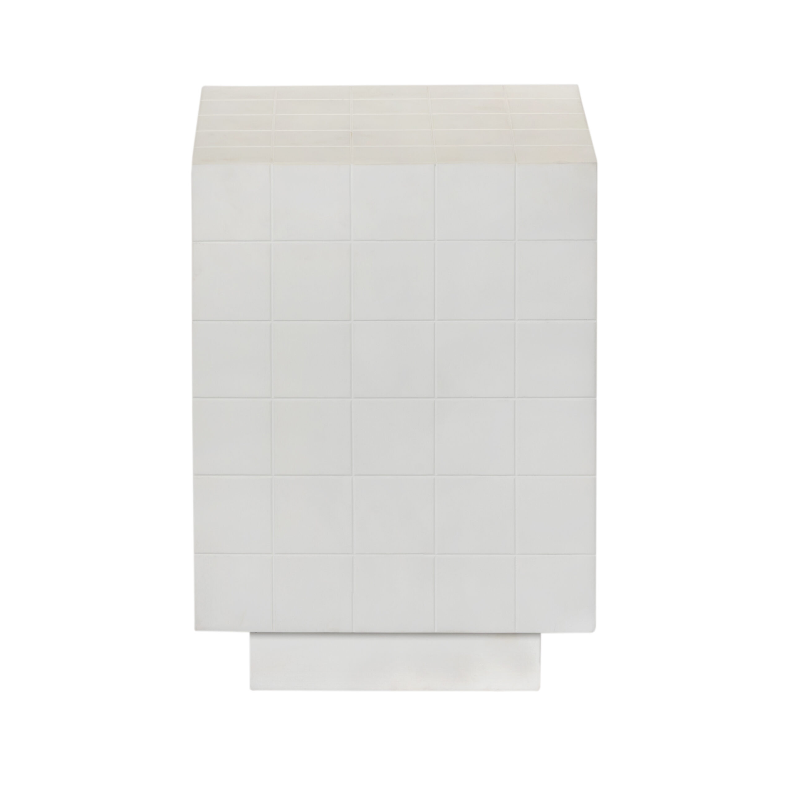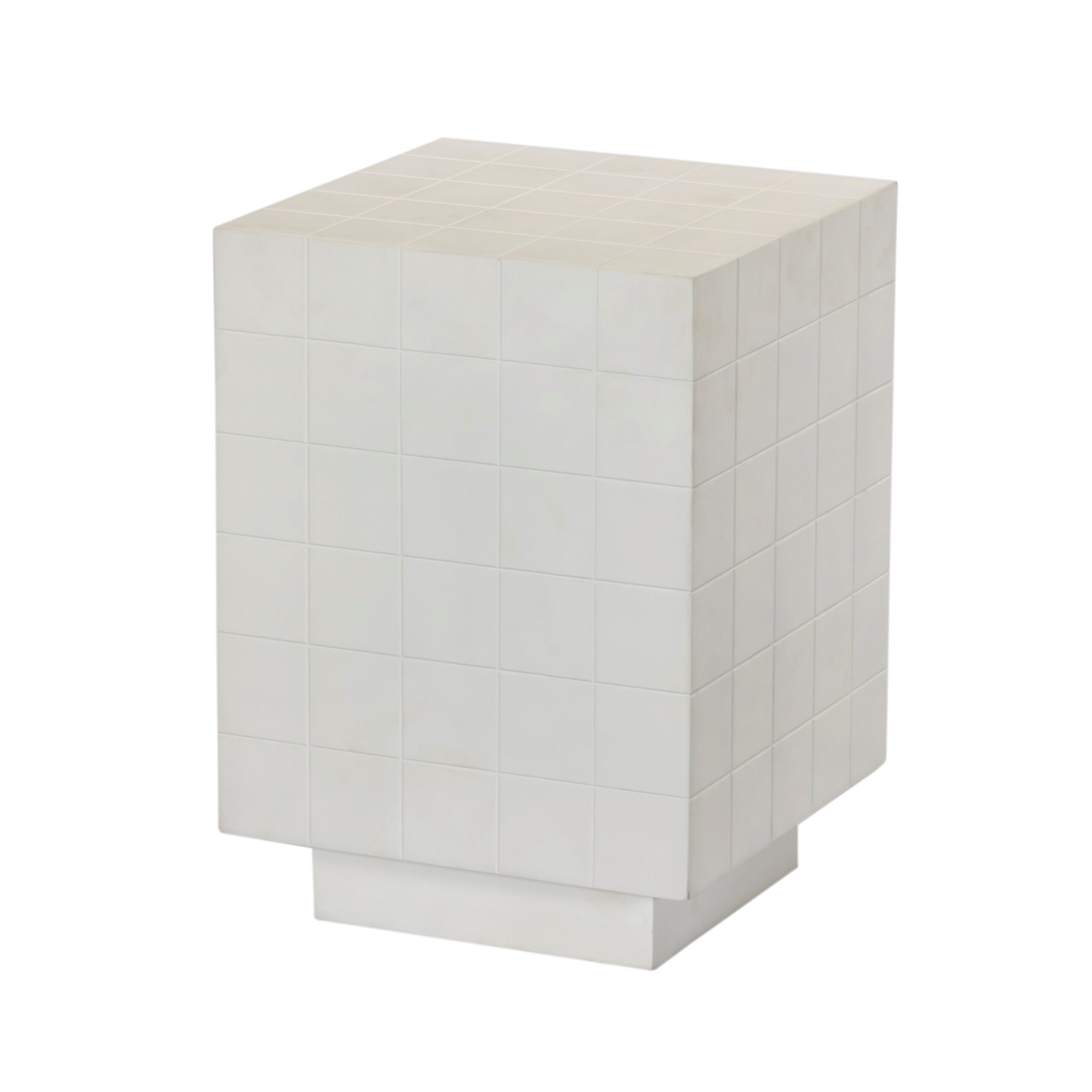 This side table showcases a modern, geometric design with a unique tile-like pattern crafted from mango wood. The cube-shaped table features a textured surface composed of numerous small, square sections, creating a visually captivating grid effect. This intricate detailing adds depth and dimension to the piece. Elevated by a smaller, rectangular base, this side table offers a stable and stylish surface for lamps, books, or decorative objects, adding a touch of modern artistry to any living space.